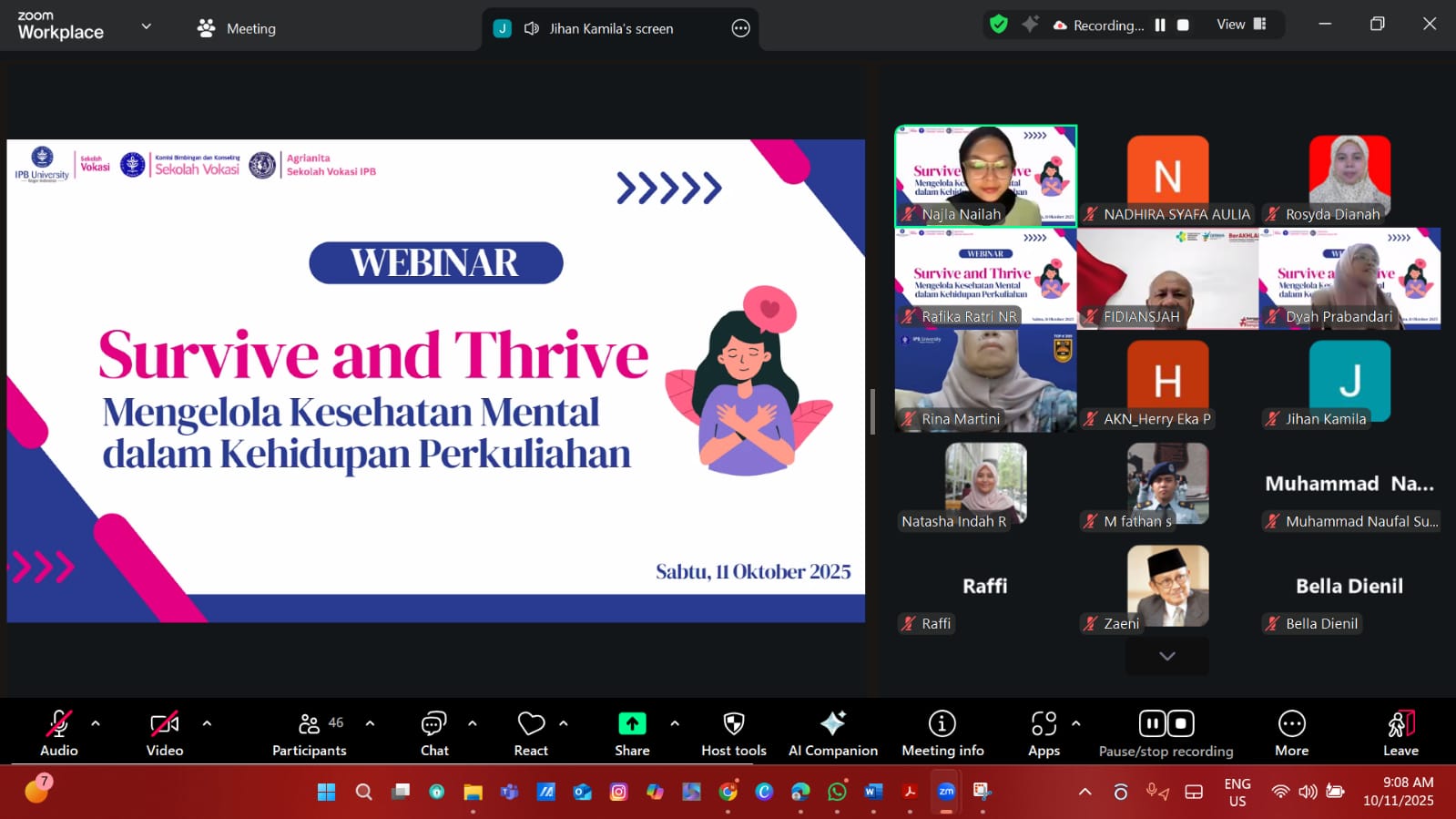 Sekolah Vokasi IPB University melalui Tim Bimbingan Konseling dan Coaching kembali menggelar agenda penguatan kapasitas mental mahasiswa melalui kegiatan webinar bertajuk “Survive and Thrive: Mengelola Kesehatan Mental dalam Kehidupan Perkuliahan”. Webinar ini dilaksanakan secara daring pada Sabtu (11/10), dan merupakan hasil kolaborasi antara Tim Konseling Sekolah Vokasi IPB, Rumah Sakit Marzoeki Mahdi (RSMM) Bogor, dan Agrianita Sekolah Vokasi IPB University.